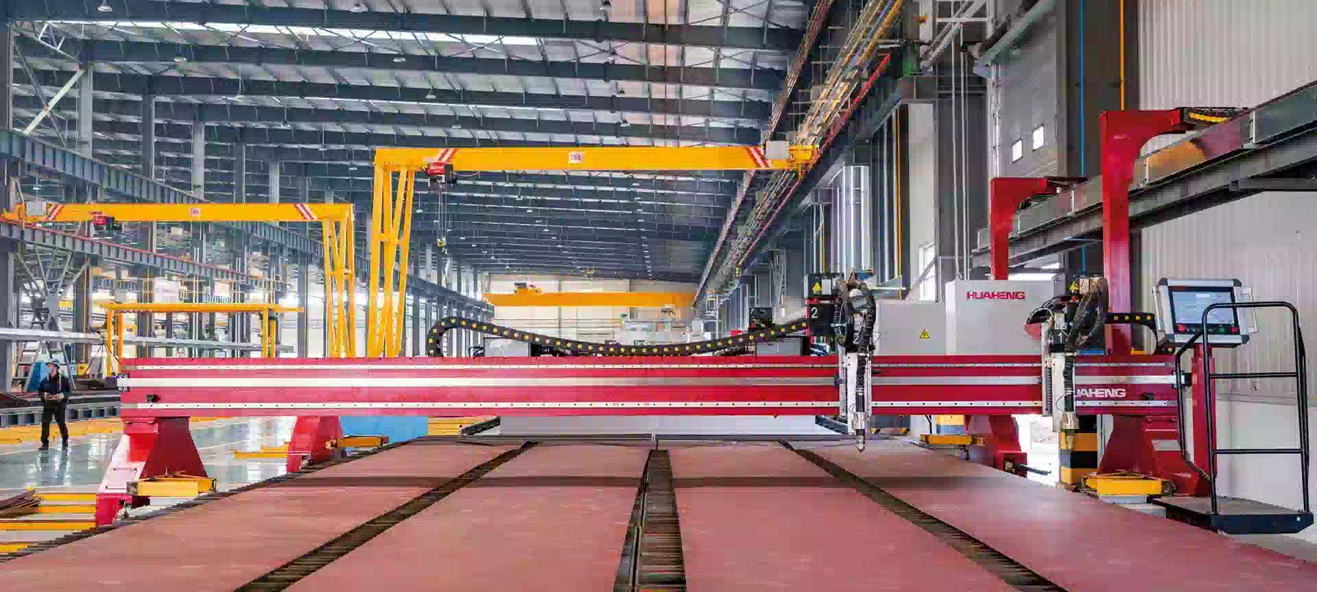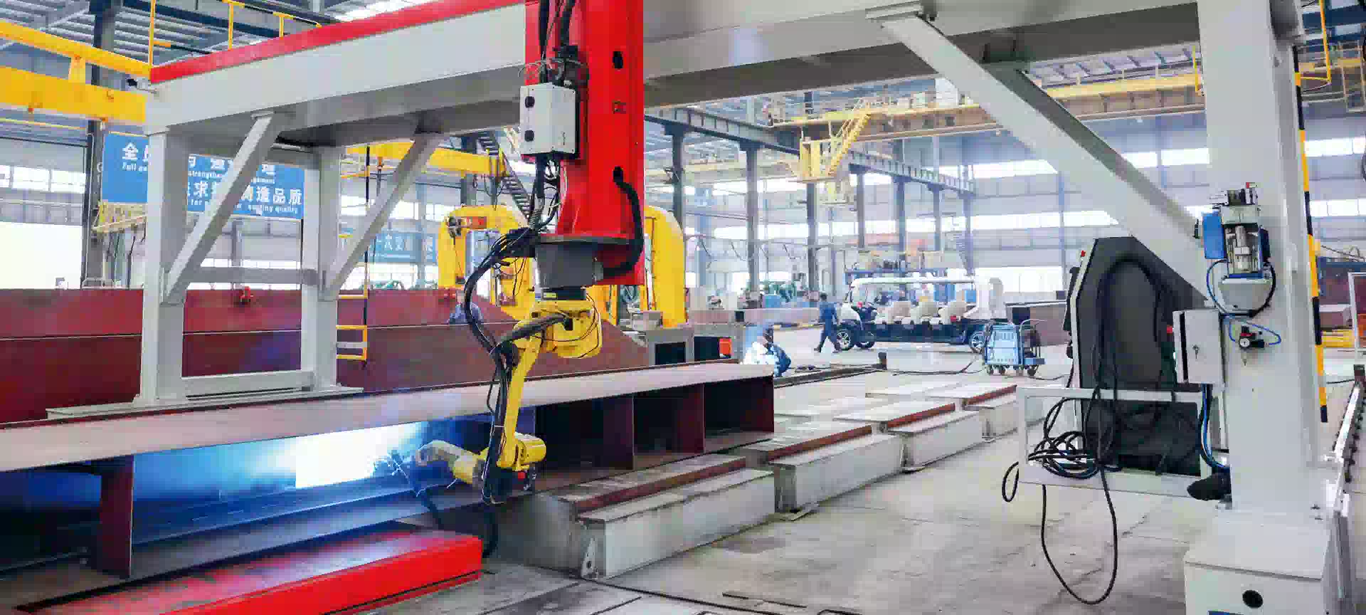 Double gun gantry welding centerThe company has multiple double gun gantry submerged arc welding machines for welding the outer longitudinal seams of main beams and end beam box type structural components. The welding of the main beams adopts the double wire welding method. It is the first in China to develop a crane arch parabolic mechanical weld seam tracking automated welding process equipment, achieving fully automated welding processes for crane curves and variable cross-sections