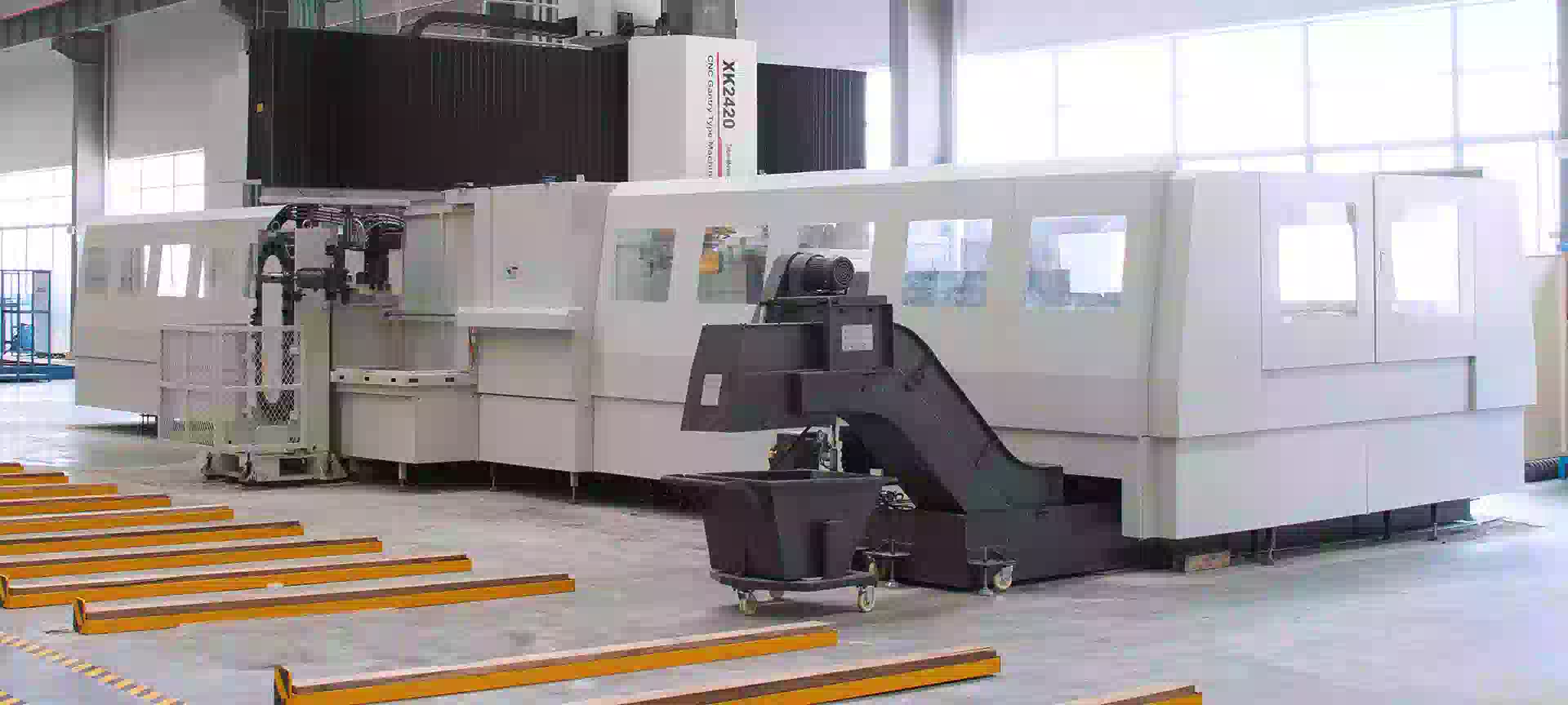 Large scale shadow data gantry milling machineOne CNC gantry milling machine XK2740 and two XK2420, with machining stroke ranges of 10000 × 4000x (300~1900) mm, 6000 × 2000 × 1200mm, and 5000 × 2000 × 1200mm respectively, are used for machining integral small frame, pulley beam, crossbeam, intermediate end beam, balance beam, etc.